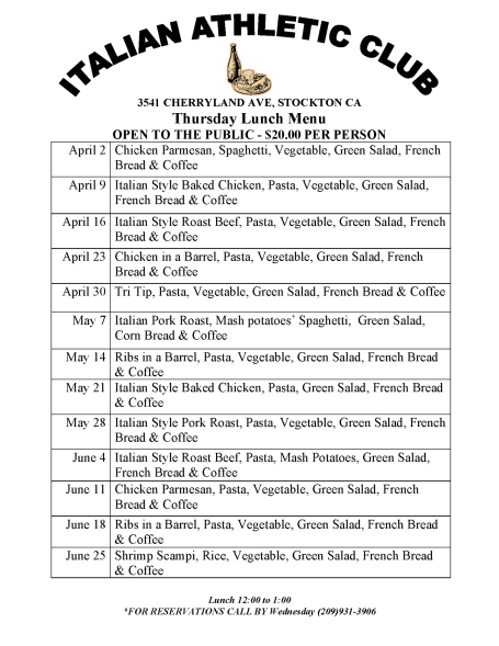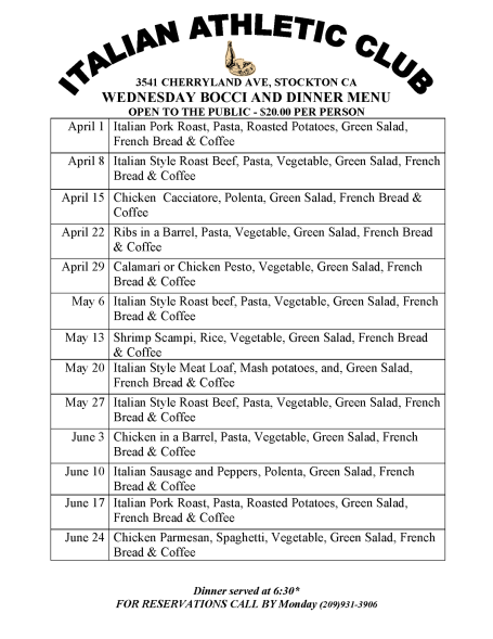Wednesday Bocce Dinner and Thursday Lunch Menus